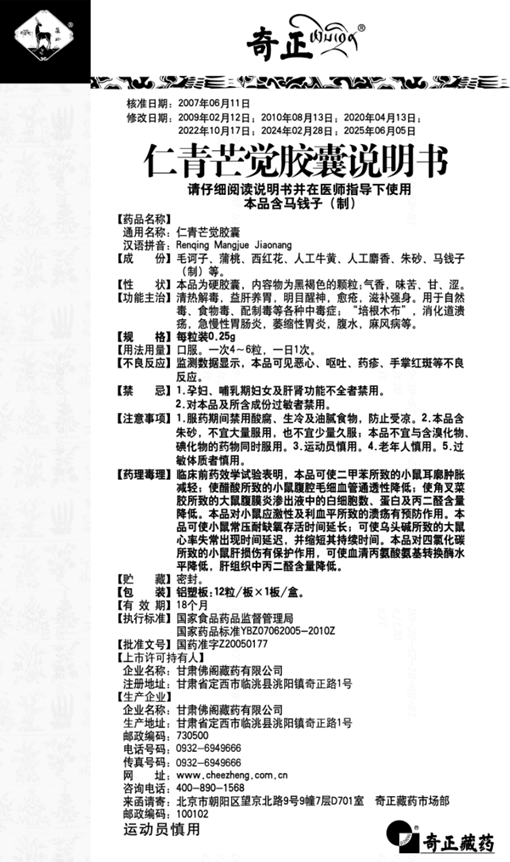 甘肅佛閣藏藥有限公司按照仁青芒覺膠囊獲批的國家藥品監督管理局藥品補充申請通知書內容,對仁青芒覺膠囊藥品說明書中的【不良反應】、【禁忌】和【注意事項】進行了修訂及備案,現將新版說明書予以發布,如您需要更為詳細的信息或有特定的問題,可以聯系客服400-890-1568或撥打企業電話:0932-6949666。